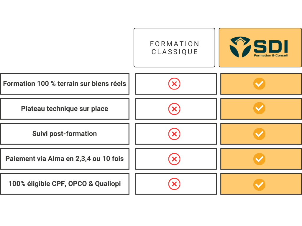 Issu d’un cabinet de diagnostic immobilier en activité, SDI Formation transmet le savoir-faire de professionnels qui exercent au quotidien. Nos formateurs ne vous enseignent pas la théorie : ils partagent leur pratique.